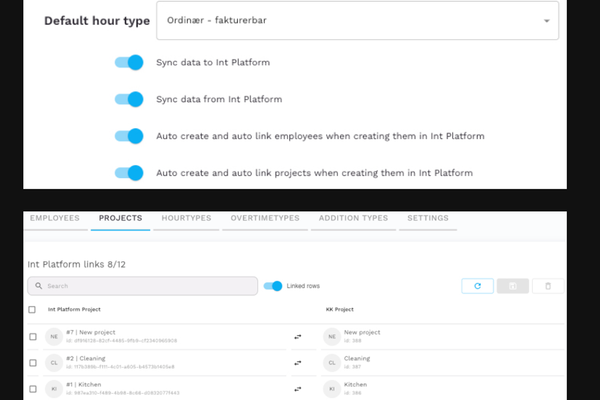 Dataene synkroniseres hvert andre minutt. Opprettelse av ansatte og prosjekt kan skje manuelt eller automatisk(dersom man velger dette)