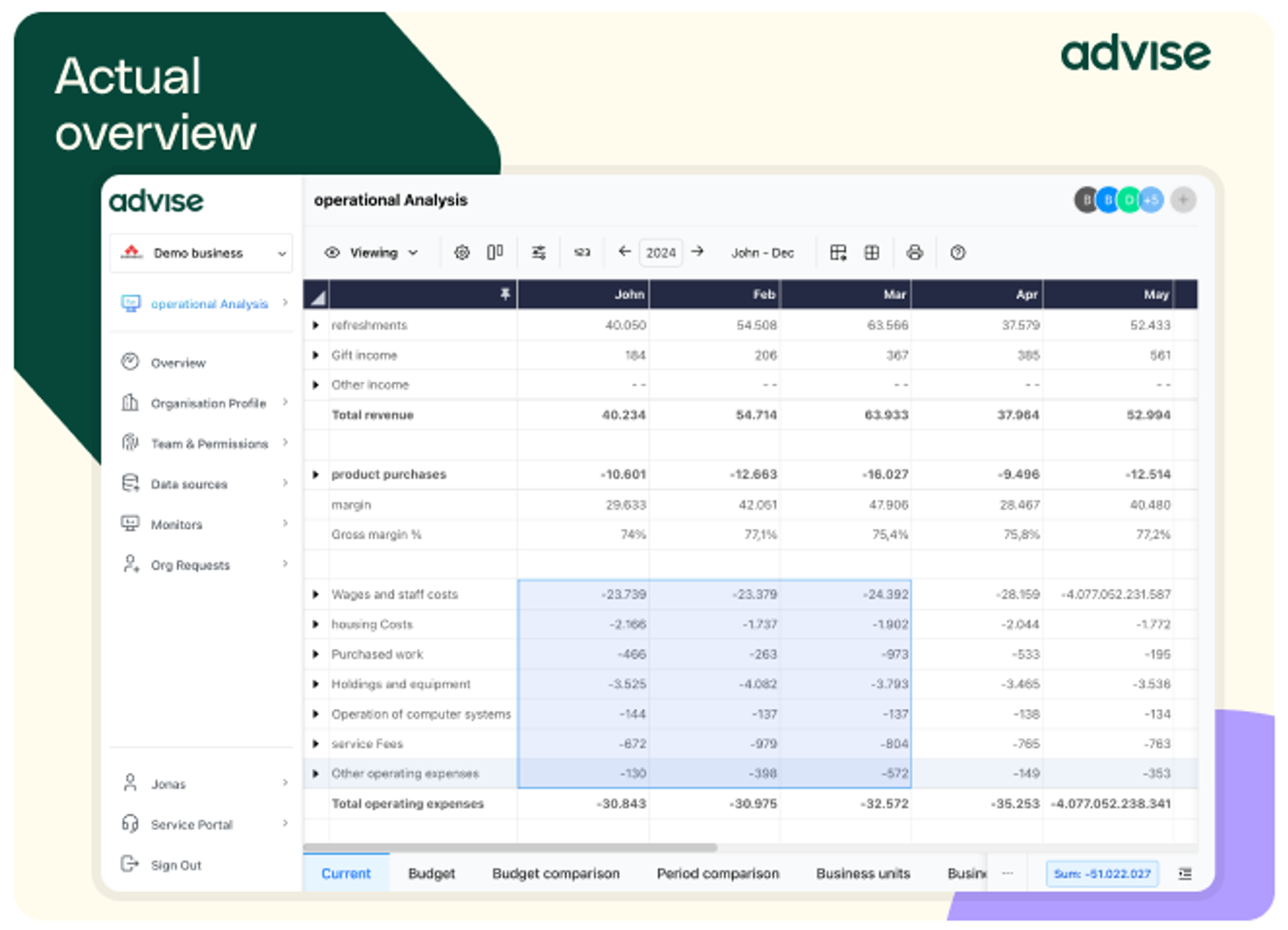 Advise er en brukervennlig og automatisert BI-løsning som hjelper virksomheter med finansiell analyse og innsikt i drift. Systemet forenkler budsjettering, avviksanalyse og rapportering, og gir ledere sanntidsoversikt over nøkkeltall gjennom visuelle dashbord. Advise er spesielt egnet for små og mellomstore bedrifter i ulike bransjer som ønsker bedre kontroll og innsikt uten tungt manuelt arbeid.