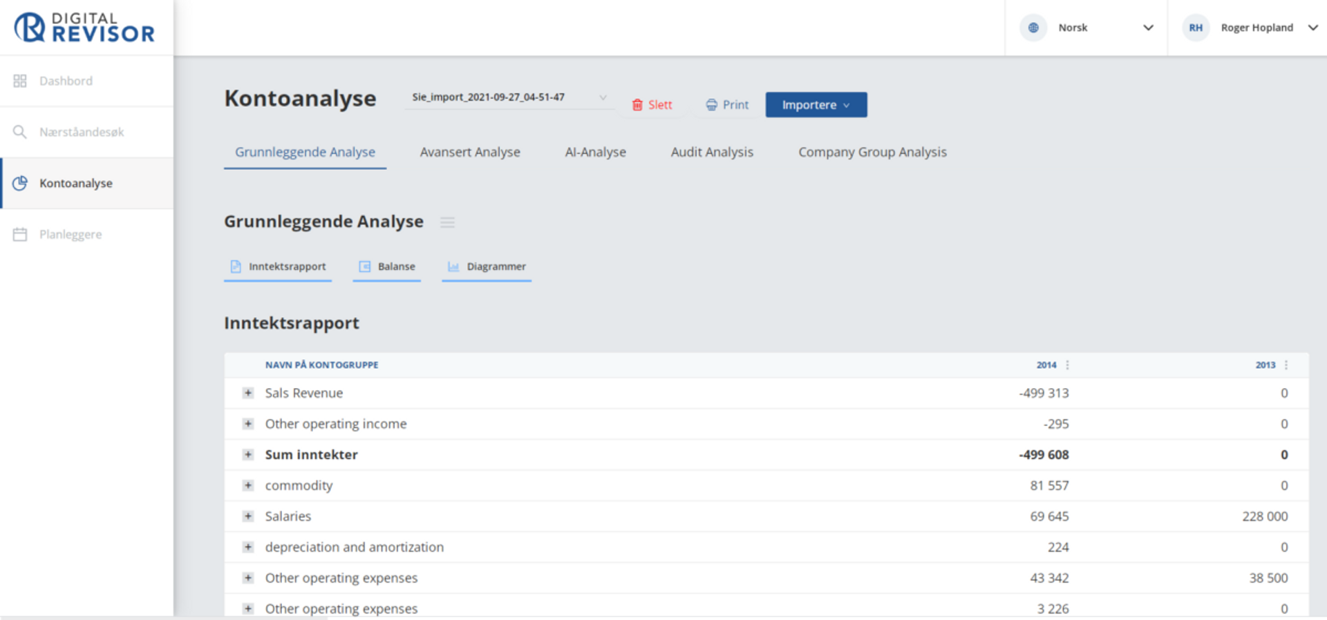 Henter all informasjon om regnskapet til en kunde og analyserer for å finne nøkkeltall og å lettere gjøre jobben for regnskapsfører eller revisor. Data fra analyse kan også bli brukt til å gjøre en risikoanalyse.